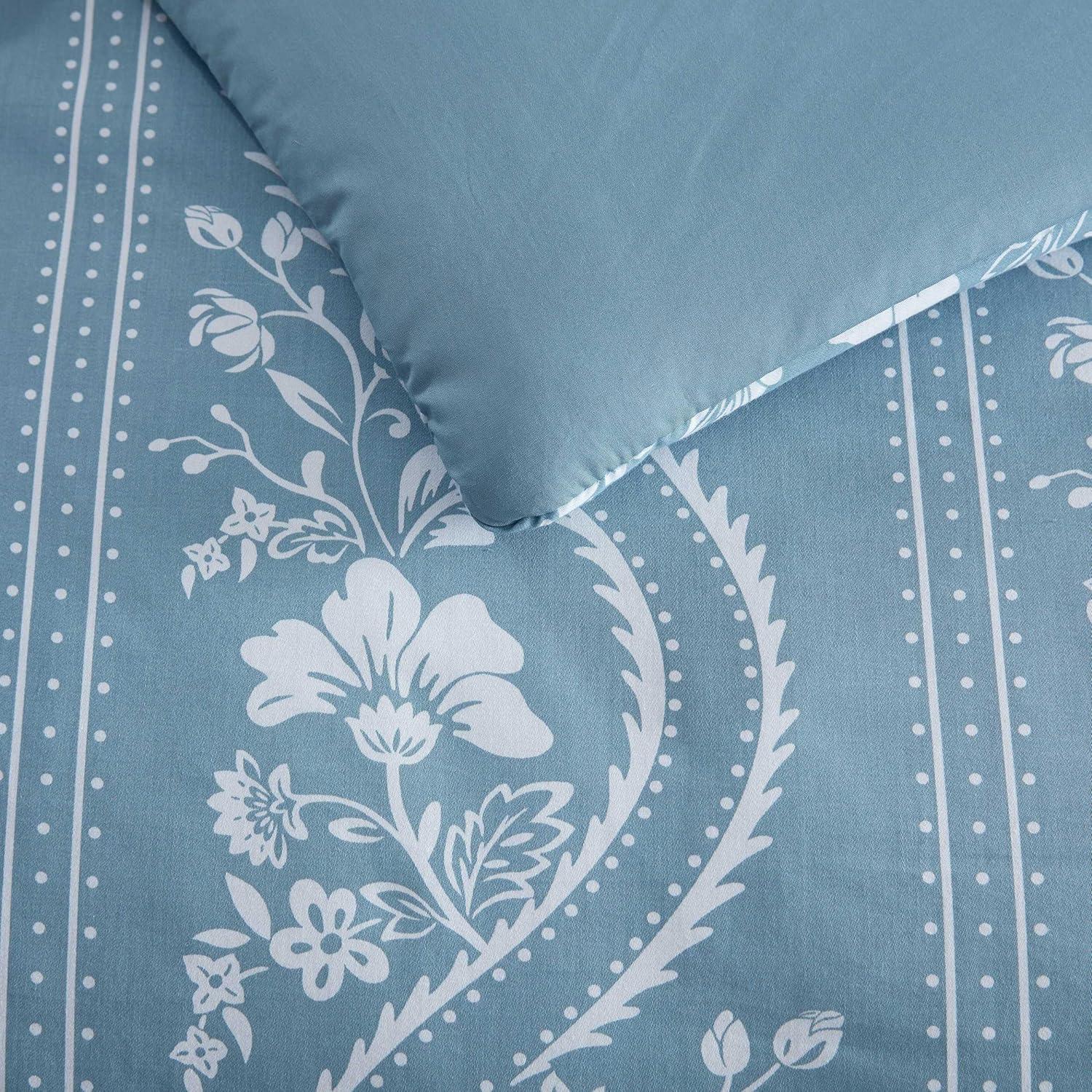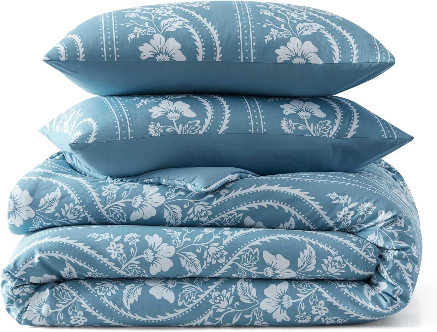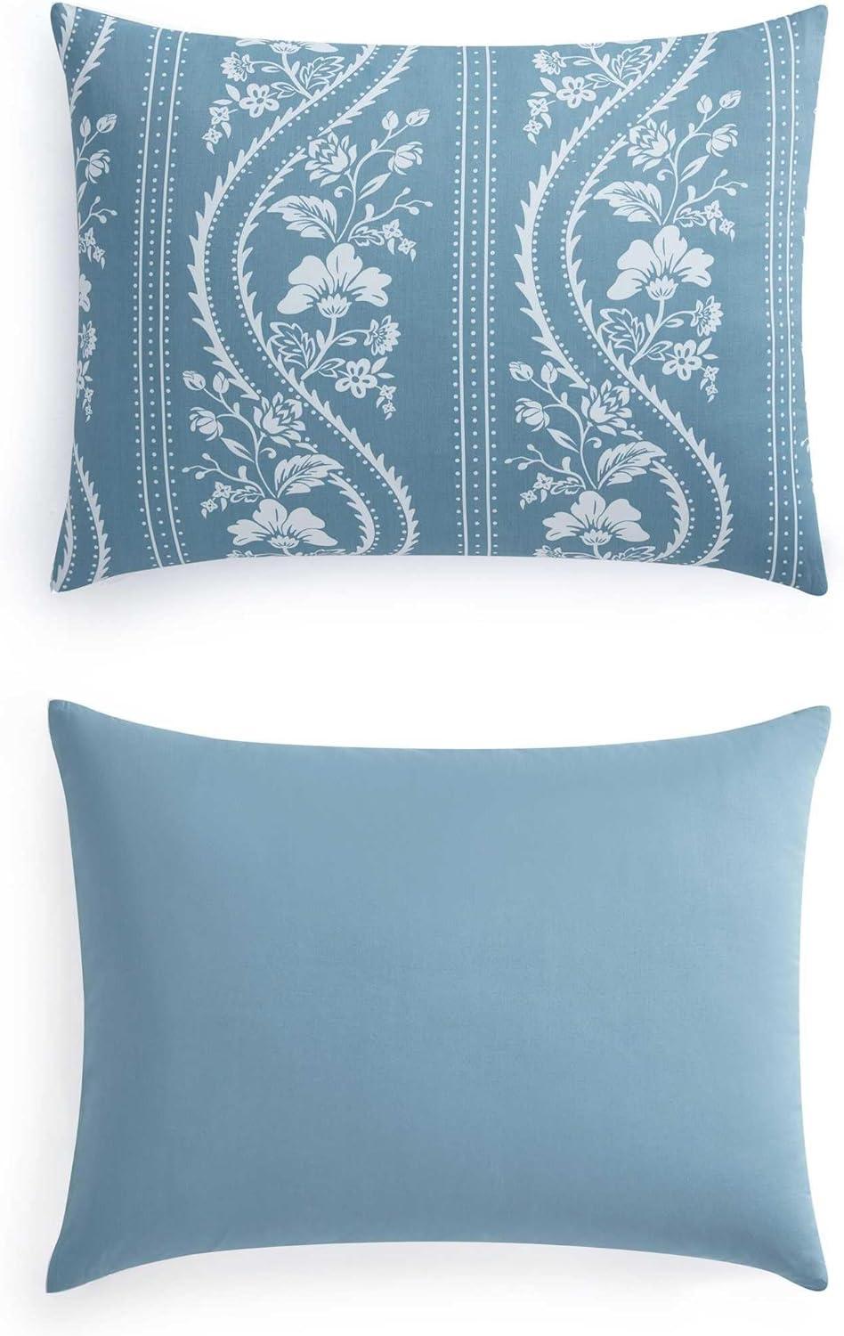 Martha Stewart – Queen Duvet Cover Set, Smooth Sateen Front with Subtle Sheen & Lightweight Cotton Percale Reverse, 3 Piece Bed Set with Matching Pillowcases (Sophia Stripe Blue)(Vivian Floral Blue)