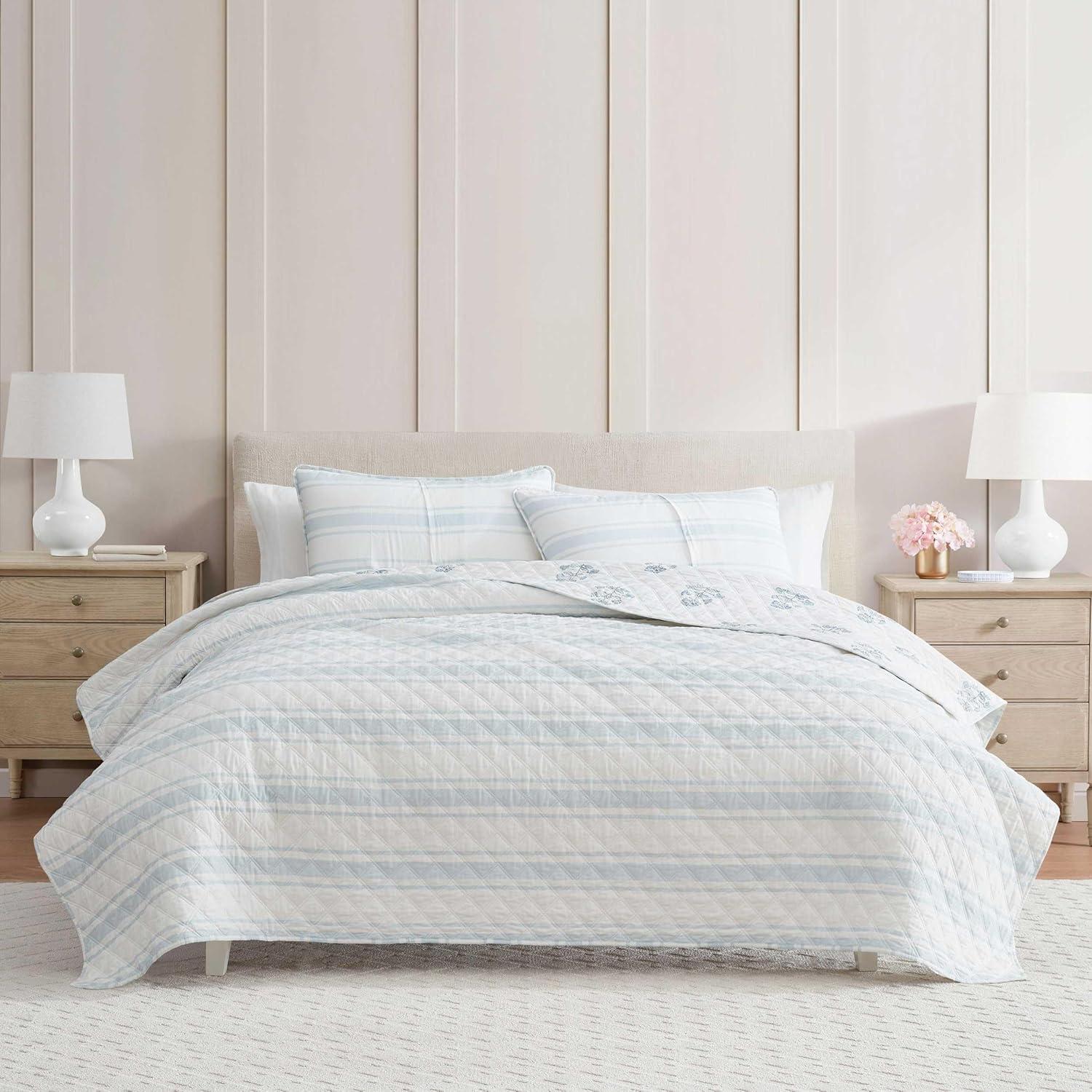 Martha Stewart-Chloe 100% Cotton Quilt Set-Percale Breathable Bedroom Decor, Soft & Machine Washable, 3Piece Bedding Set (White/Bedford Blue/Clver Green)