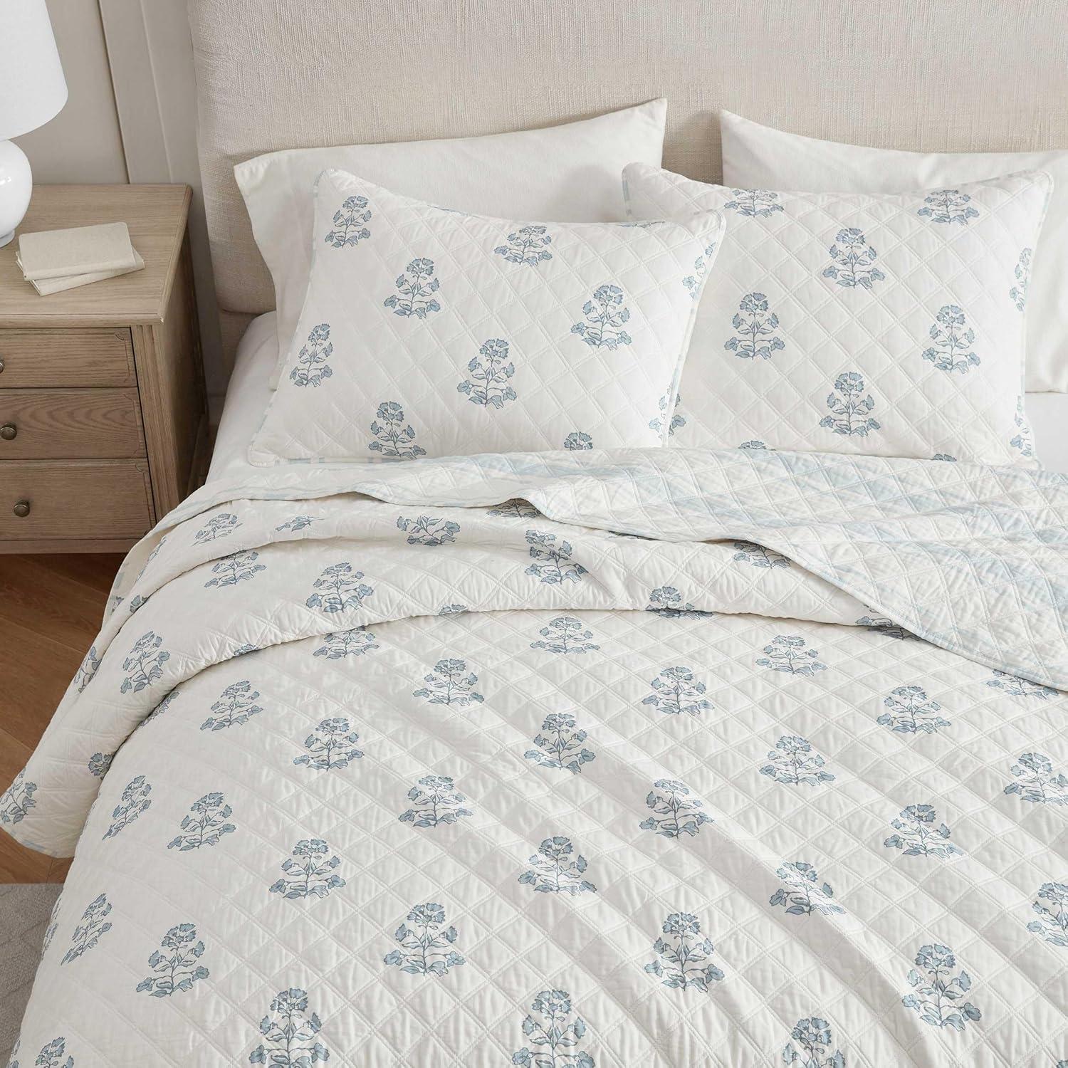 Martha Stewart - Queen Quilt Set, 100% Soft & Breathable Bedding with a Lightweight Feel for Year Round Comfort, 3 Piece Bed Set with Matching Pillowcases (Olivia Gingham Blue)(Flower Block Blue)