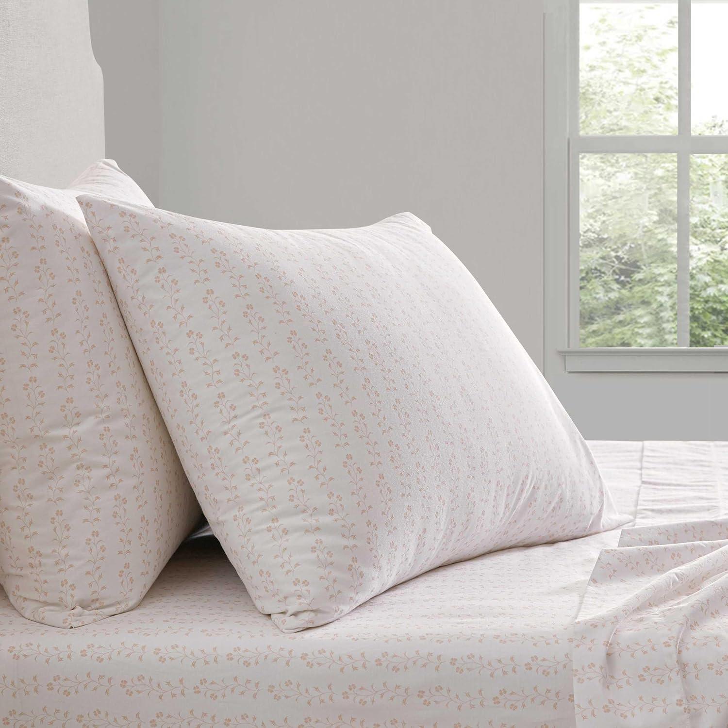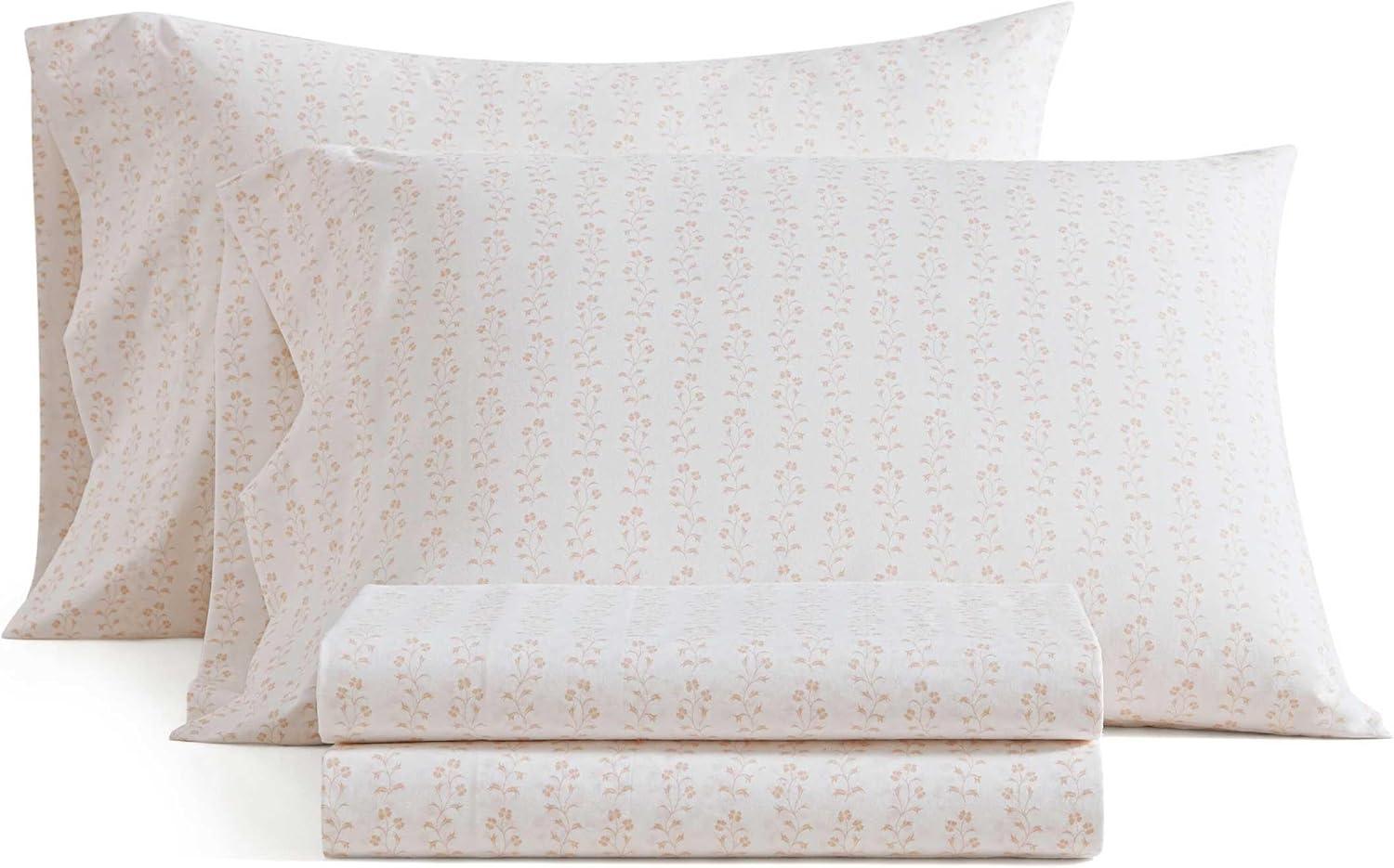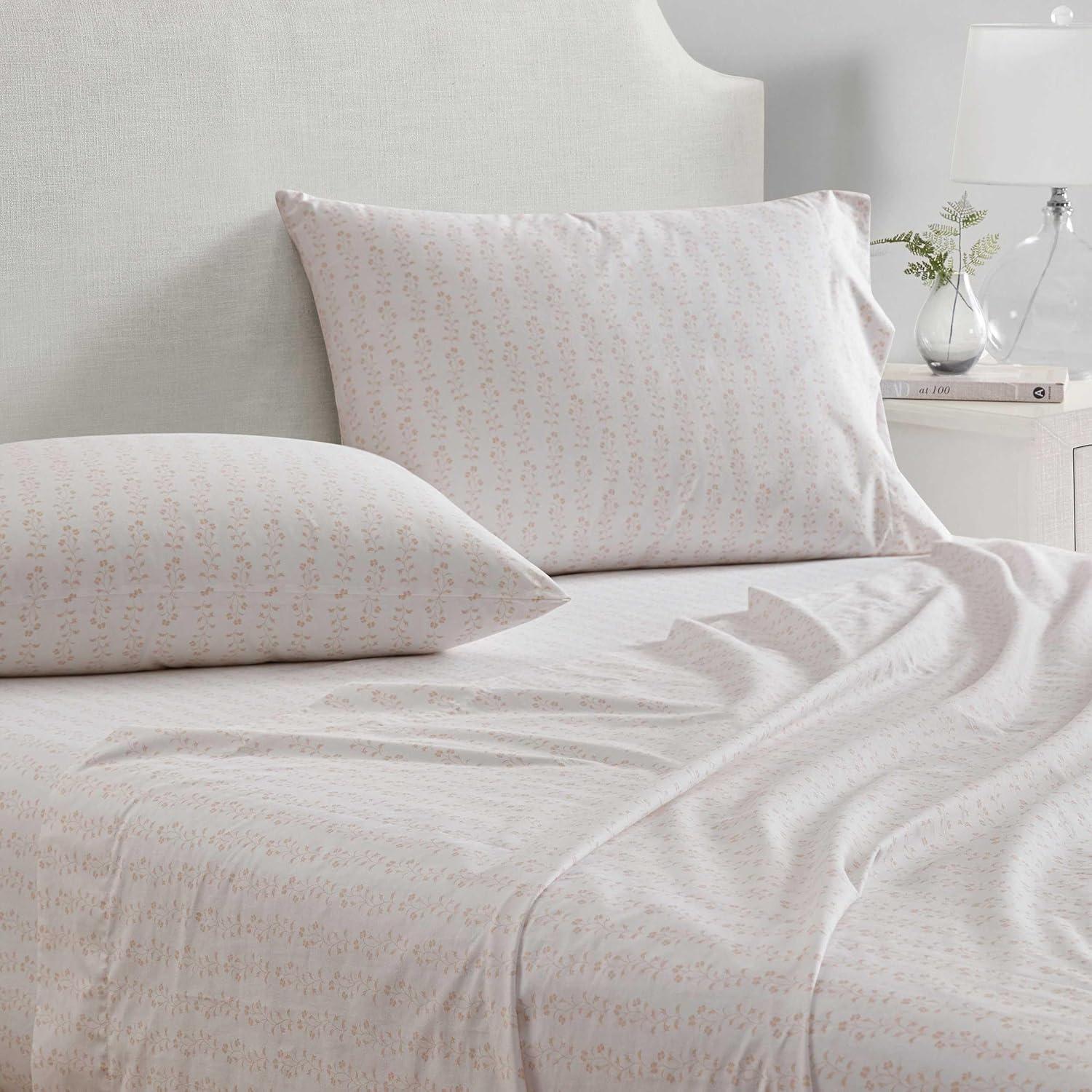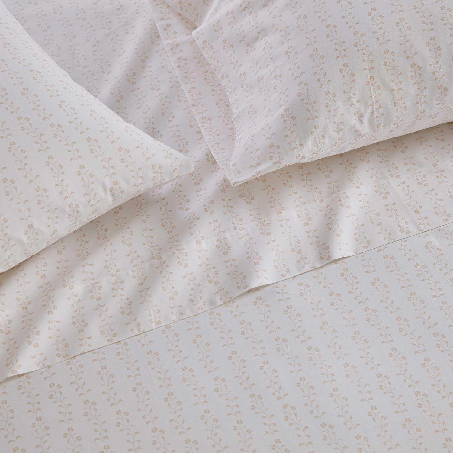 Martha Stewart - Queen Size Sheets Set, Crisp & Tailored Cooling Sheets with a Smooth Cotton Percale Lightweight Feel - Bed Sheets with Matching Pillowcases & Fitted Sheet (Francesca Stripe Beige)(Ditsy Vine Pink)