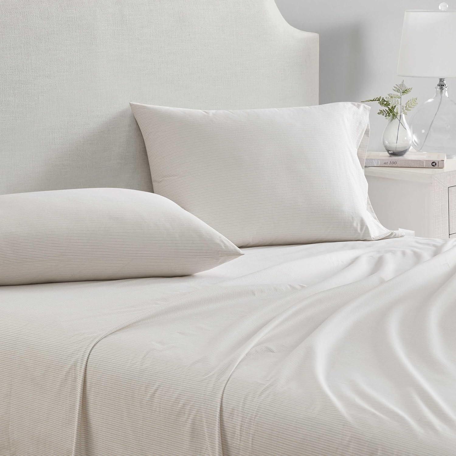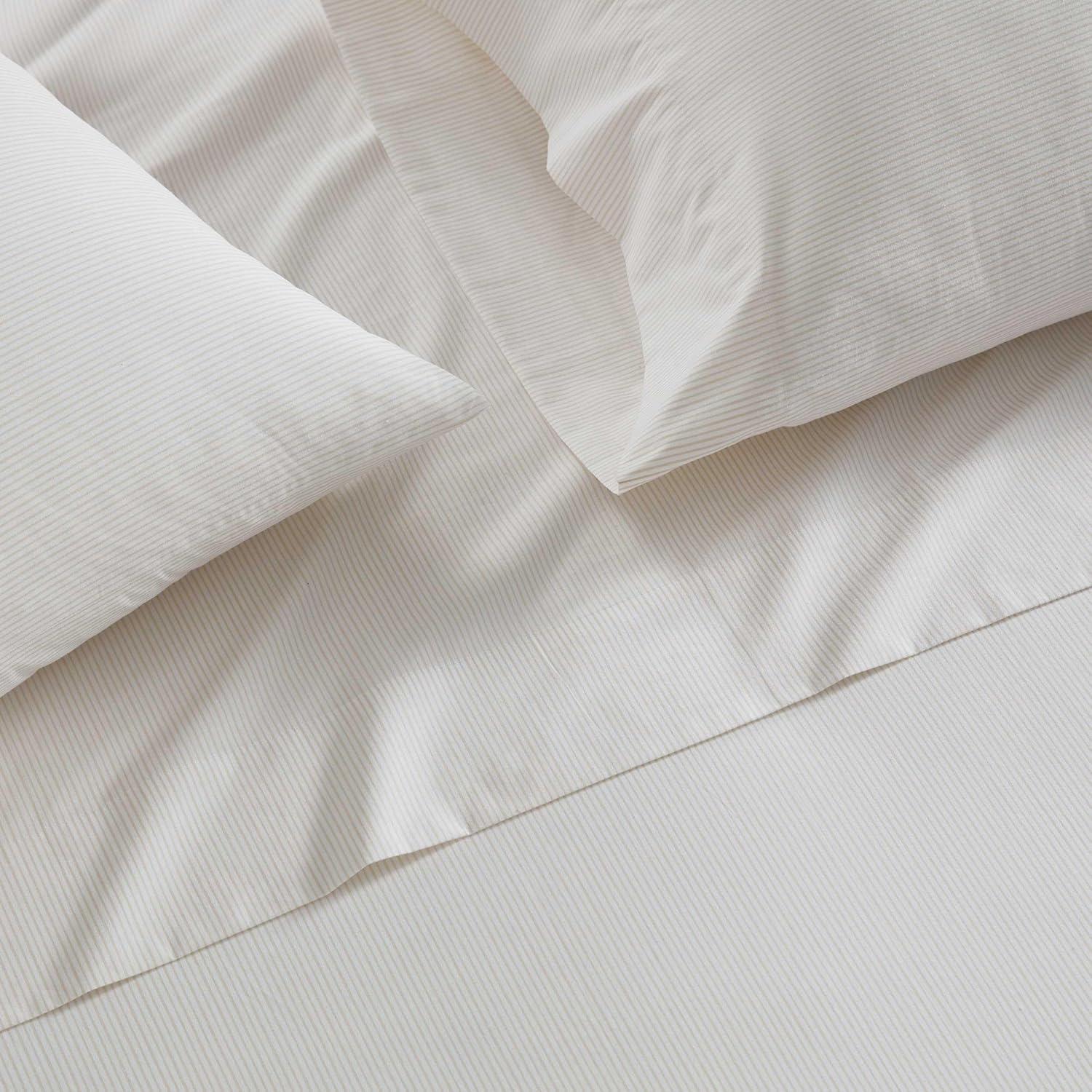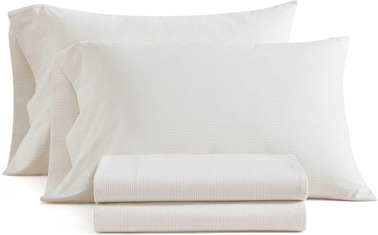 Martha Stewart - Queen Size Sheets Set, Crisp & Tailored Cooling Sheets with a Smooth Cotton Percale Lightweight Feel - Bed Sheets with Matching Pillowcases & Fitted Sheet (Francesca Stripe Beige)(Stripe White)