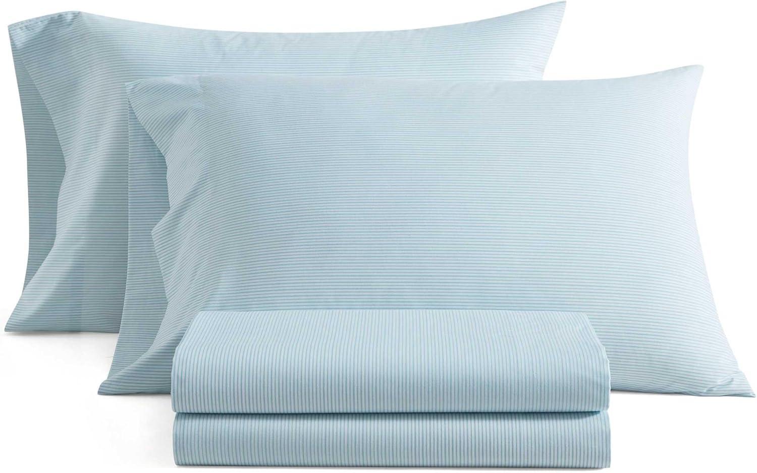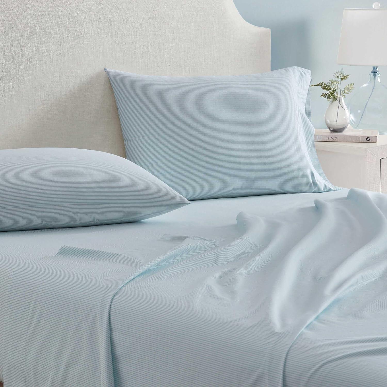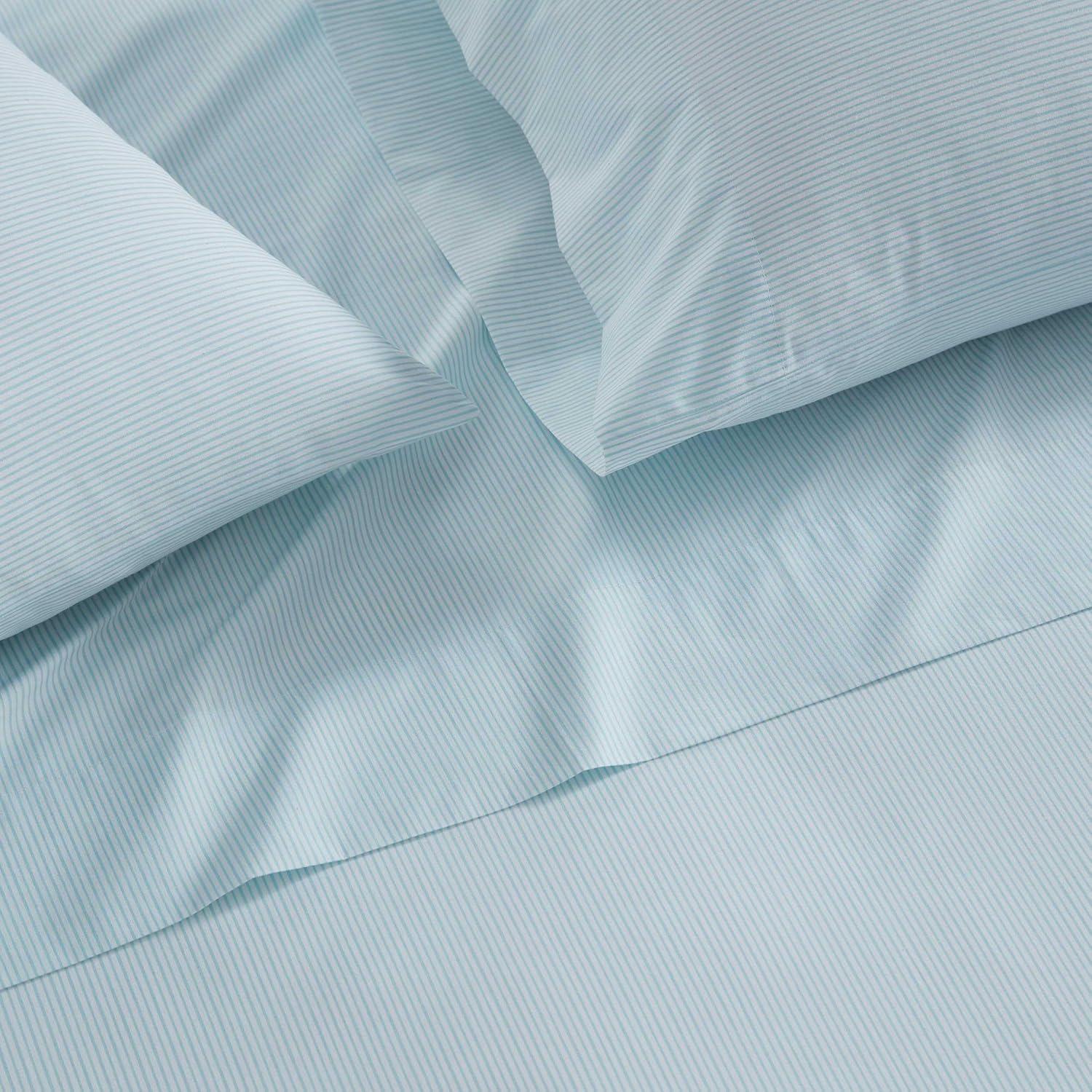 Martha Stewart - Queen Size Sheets Set, Crisp & Tailored Cooling Sheets with a Smooth Cotton Percale Lightweight Feel - Bed Sheets with Matching Pillowcases & Fitted Sheet (Francesca Stripe Beige)(Stripe Blue)