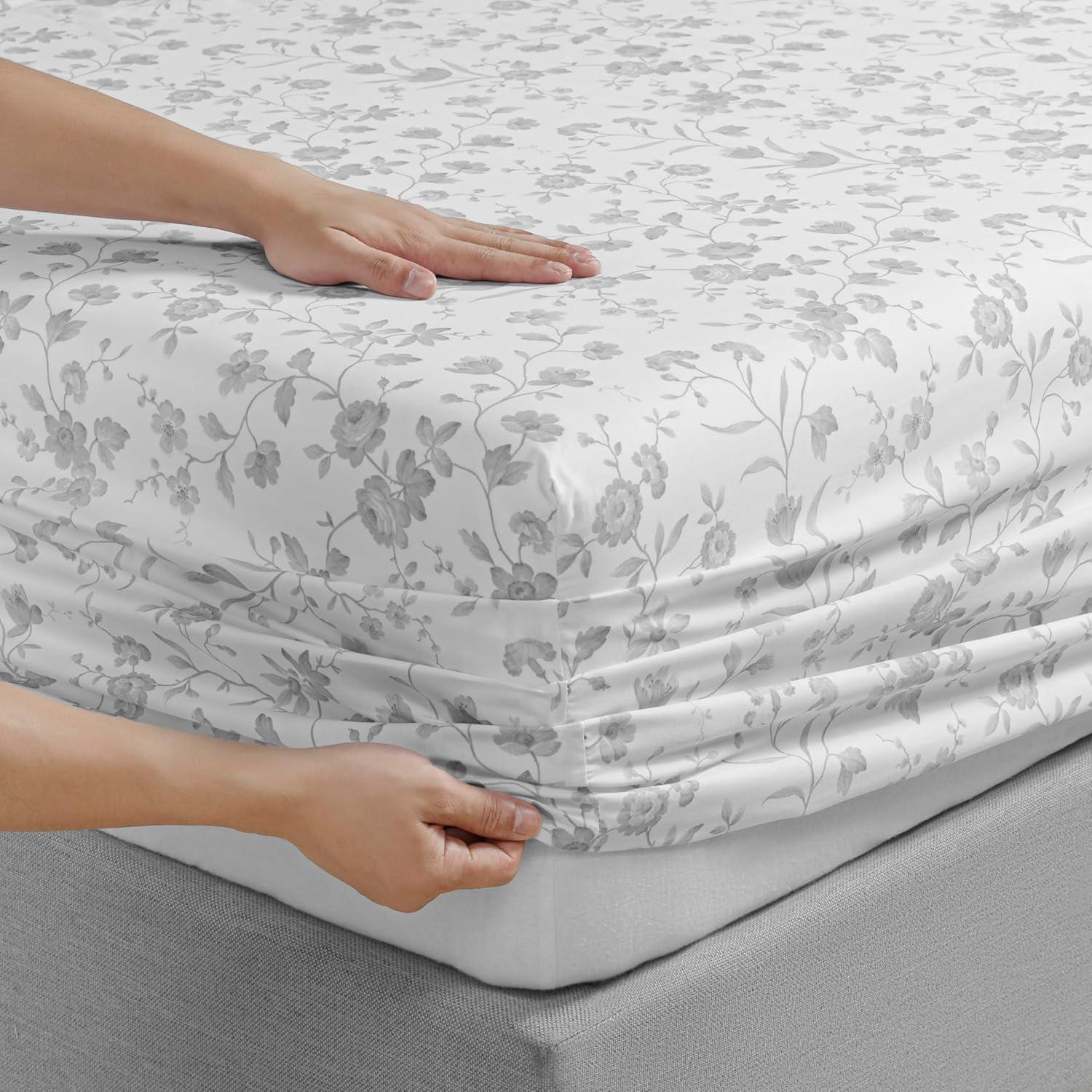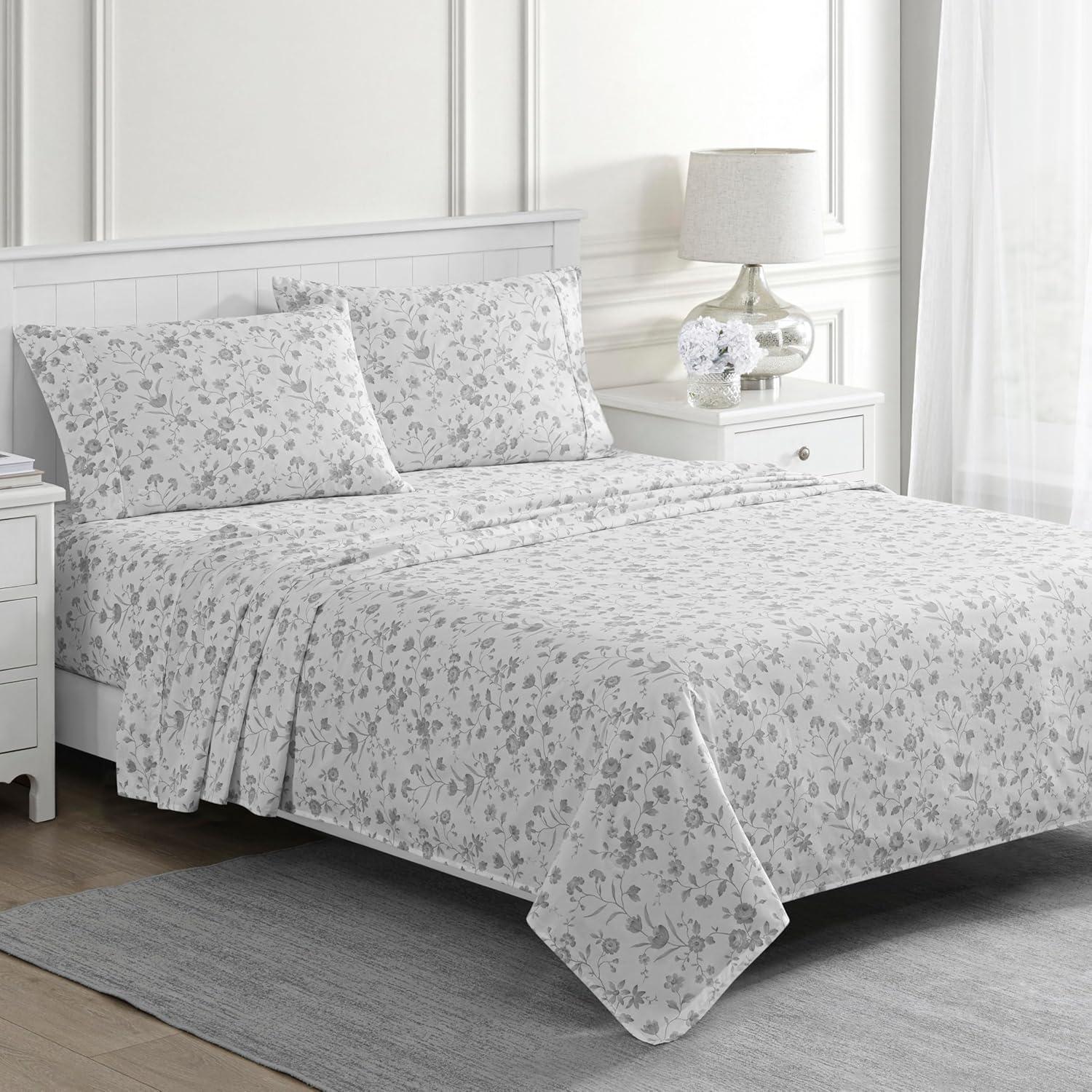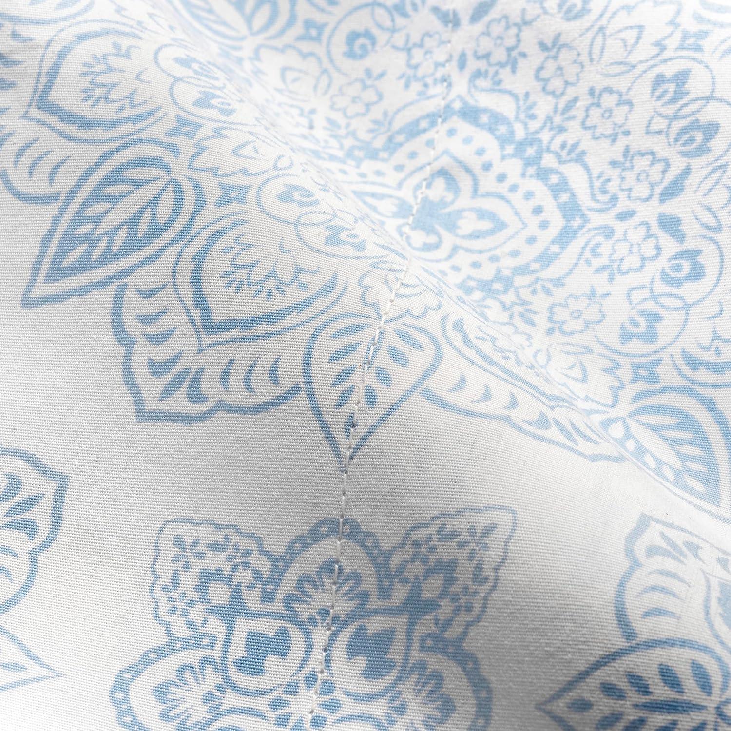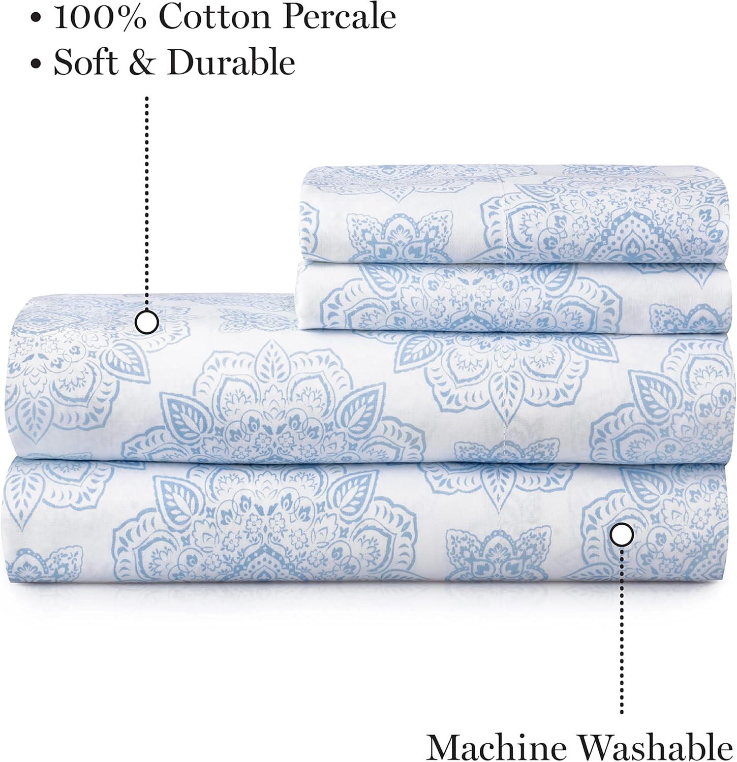 Martha Stewart Ruth Ditsy Floral 300TC 100% Cotton Percale Sheet Set, Blue/White, 4 Piece – 1 Flat Sheet, 1 Fitted Sheet, 2 Std Pillowcases, Breathable Cotton Printed Bed Sheets, Queen Size(Twin)