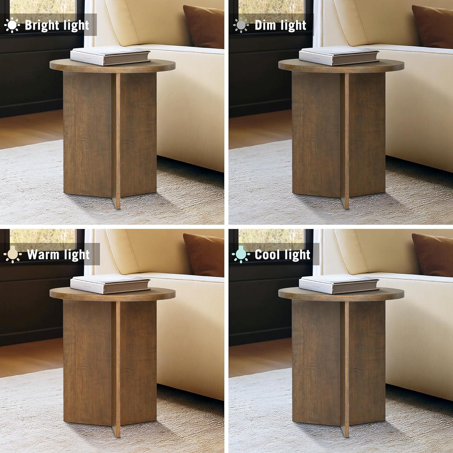 Chic Round Design – This modern coffee table features a clean, circular shape with a reclaimed greige wood finish that adds warmth and sophistication to any living room