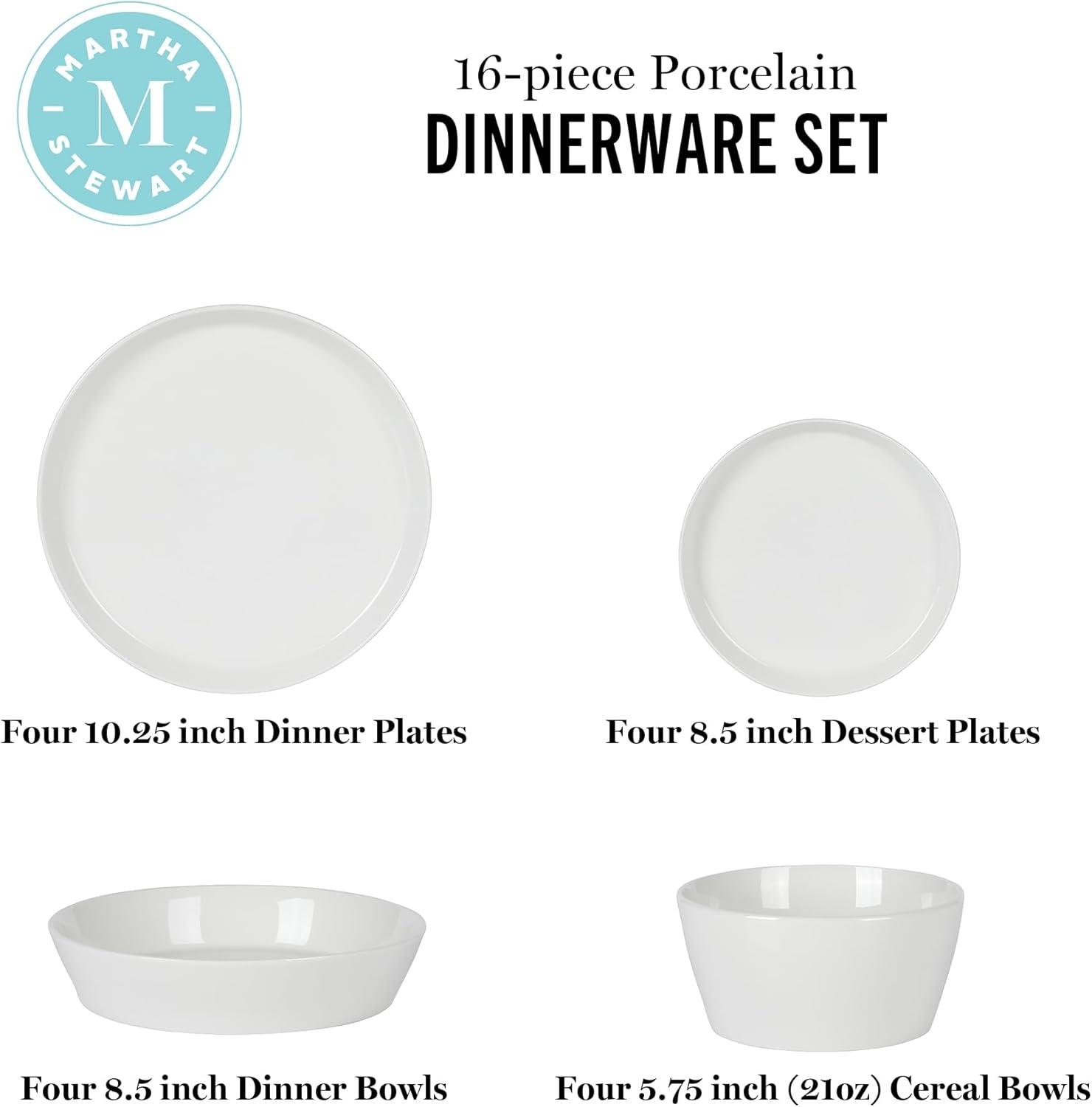 Luxe enough for everyday dining and occasional entertaining, the Martha Stewart Faretta 16-piece Porcelain Dinnerware Set is a collection of coupe plates and bowls ideal for casual suppers and small parties. Crafted from glazed porcelain, this whiteware collection is a versatile selection to layer with brighter colors and interesting textures of other tabletop pieces and accessories to stage either a minimalist or dramatic table spread. Suitable as an all-occasion gift, this classic dinnerware set is one bridal shower or wedding gift that couples will actually use when it's their turn to build family traditions and recipes in the years to come. Dishwasher and microwave safe.