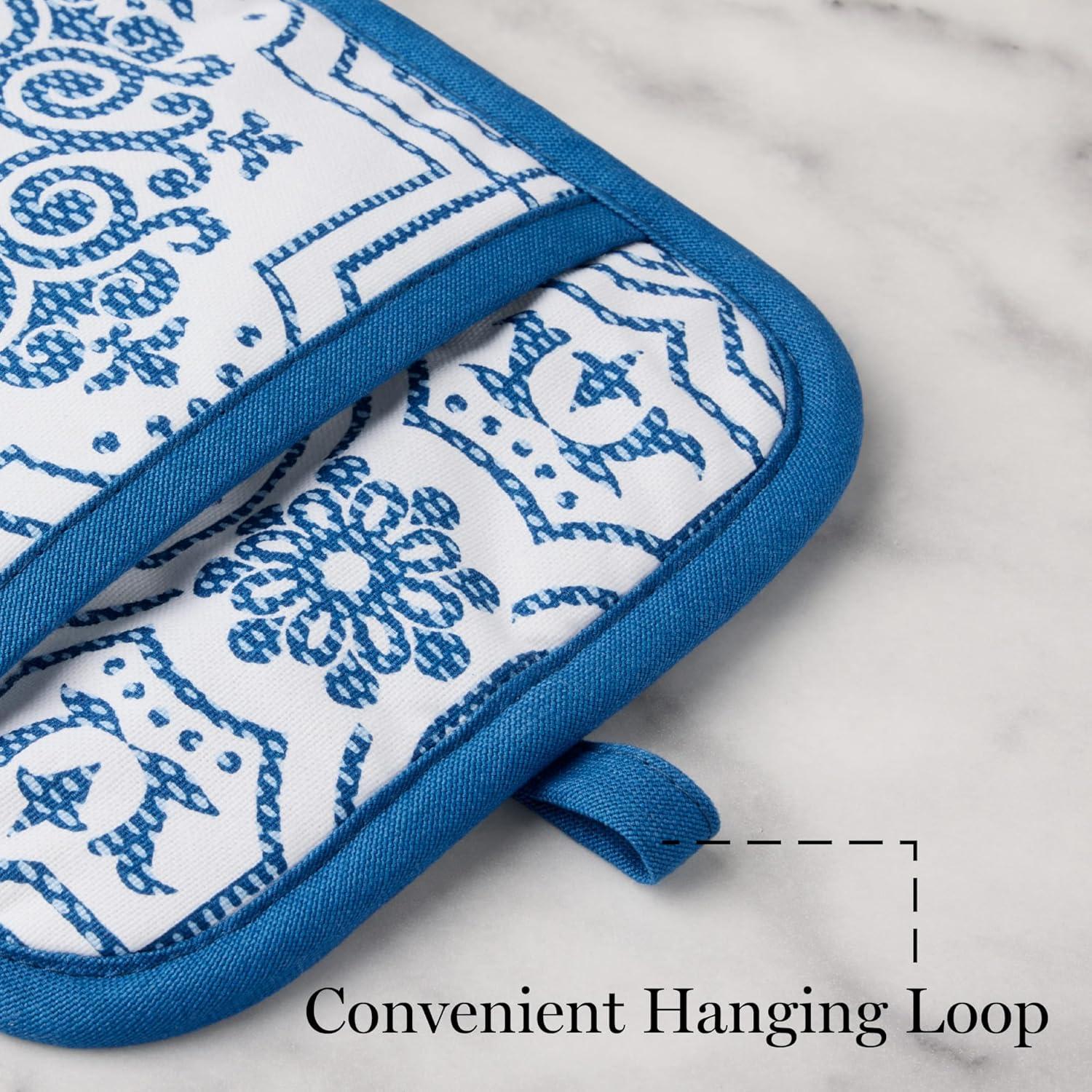 Add style and function to your kitchen decor with the Martha Stewart Strie Medallion Pot Holder 2-Pack Set. Made from thick cotton fabric with polyester lining that offers comfort and insulation. This strie medallion tile print pot holder set includes two pot holders that each measure 7 inches wide by 10 inches long for easy on and off use. They are heat resistant and will shield your hands from the heat. Includes a convenient hanging loop for display or easy storage. Machine washable for easy cleaning.