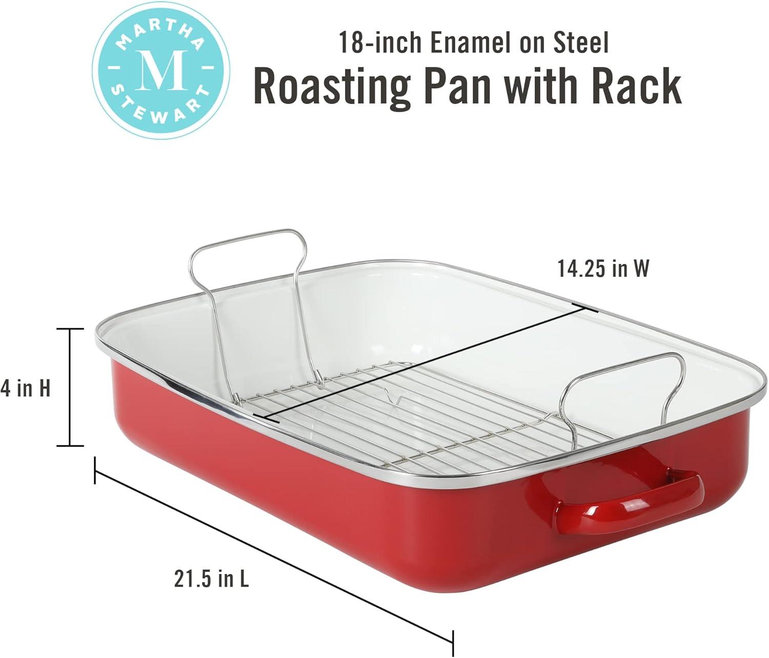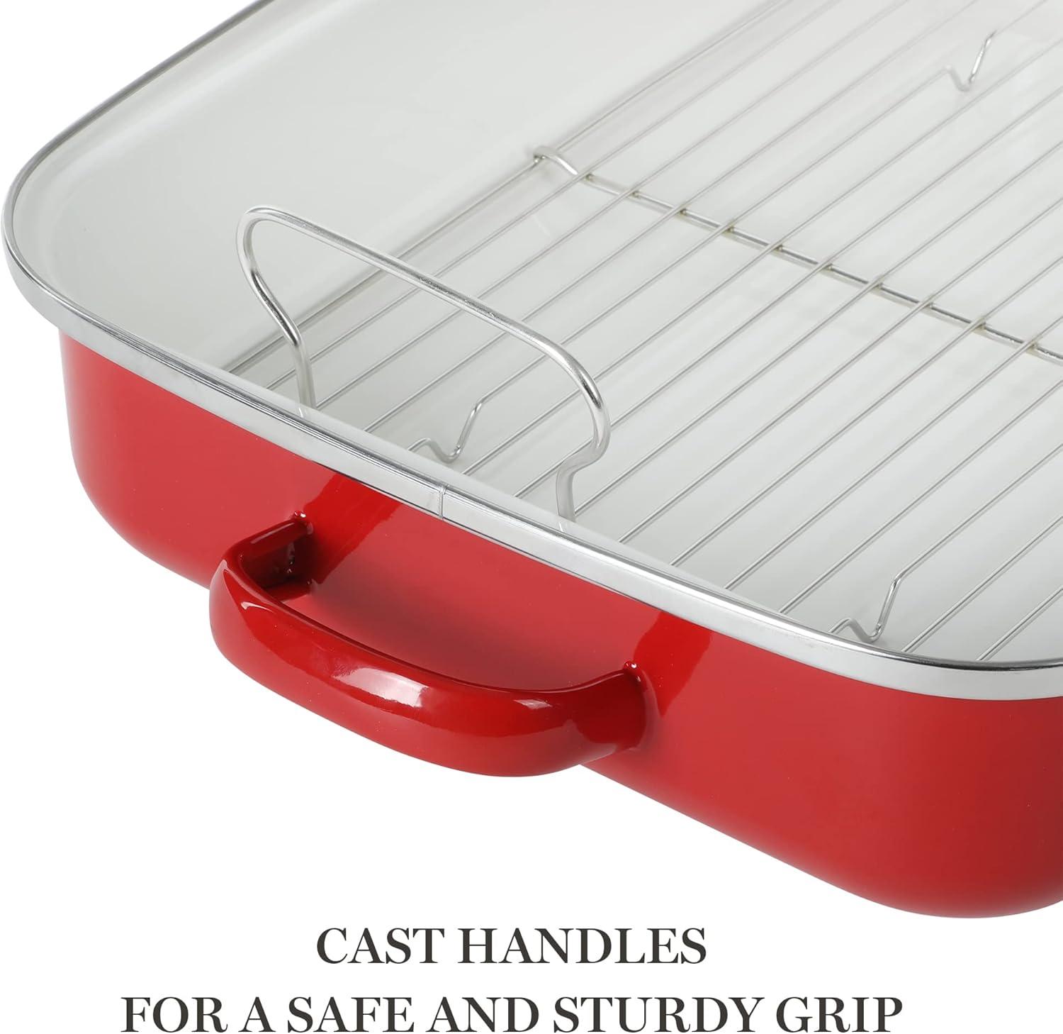 Home cooks love multi-functional kitchenware, not only for their convenience but also for efficiency and dependability. The versatile Thayer 16-inch Enamel on Steel Roaster Pan is a well-loved piece of bakeware – perfect for serving up everyday meals, pork ribs, and holiday roasts. The beautiful blue enameled exterior is hard to miss. It is as eye-catching as it is stain-resistant to set the stage for the Thanksgiving turkey or any main protein as the star of the dinner. Bake using the removable stainless steel rack to elevate food to avoid overcooking the bottom of the roast. The steel pan doubles as a baker for making lasagnas, casseroles, or roasting a bed of vegetables. With an easy-to-clean enamel interior, the steel pan is a convenient companion in everyday cooking. Cast handles provide a safe and supported grip when lifting and serving from oven to table. Hand wash only.