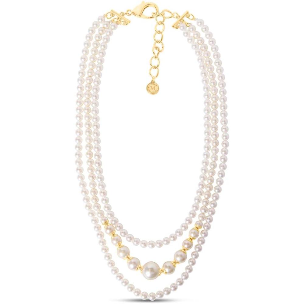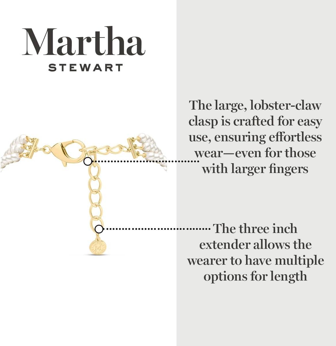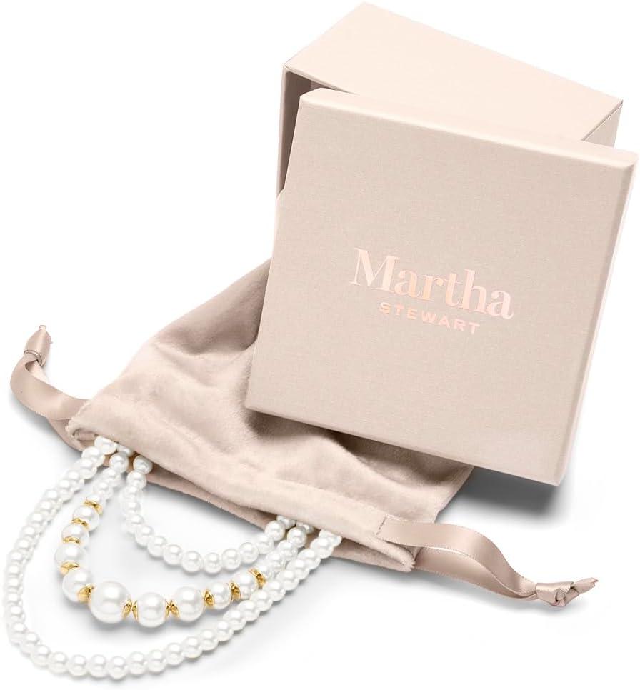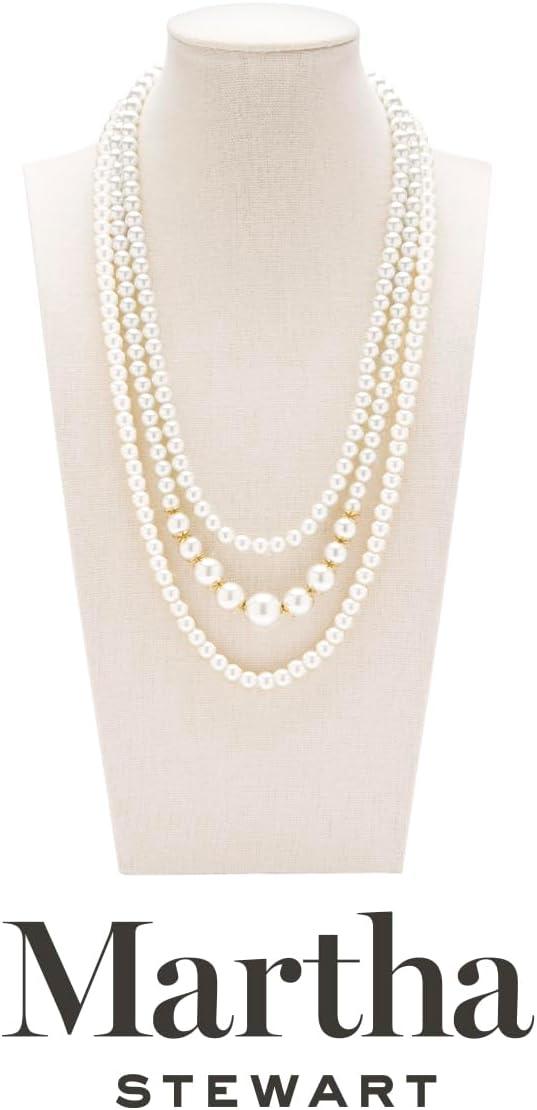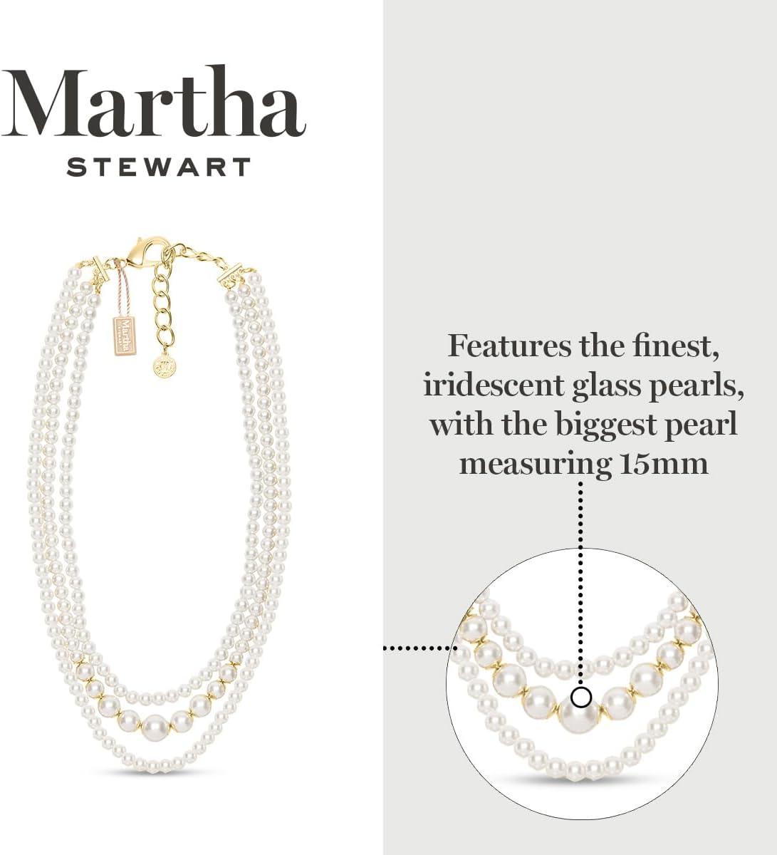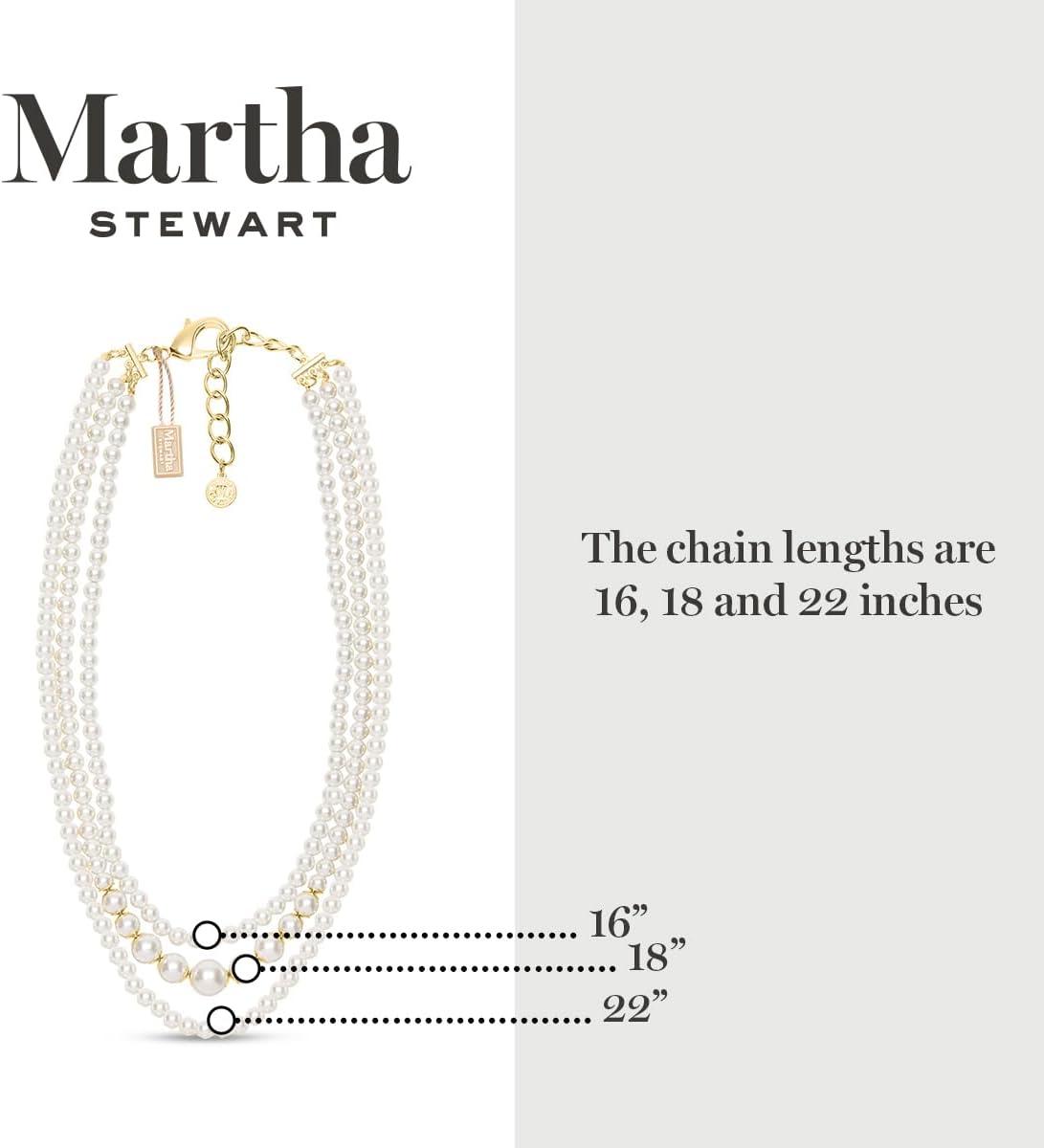 Exuding class, style, and timeless elegance, the Martha Stewart fashion jewelry collection is a true celebration of sophistication. This exquisite collection highlights distinctive chains, iridescent glass pearls, and dazzling crystals, all crafted with yellow gold-plated metal. Each piece reflects Martha Stewart's signature flair, offering a blend of uniqueness and refined style. This Martha Stewart necklace features three strands of iridescent glass pearls with the biggest iridescent glass pearl measuring 10mm. The chain lengths are 16, 18 and 22 inches. This necklace is in yellow gold-plated brass metal and has a lobster claw clasp with a three inch extender.