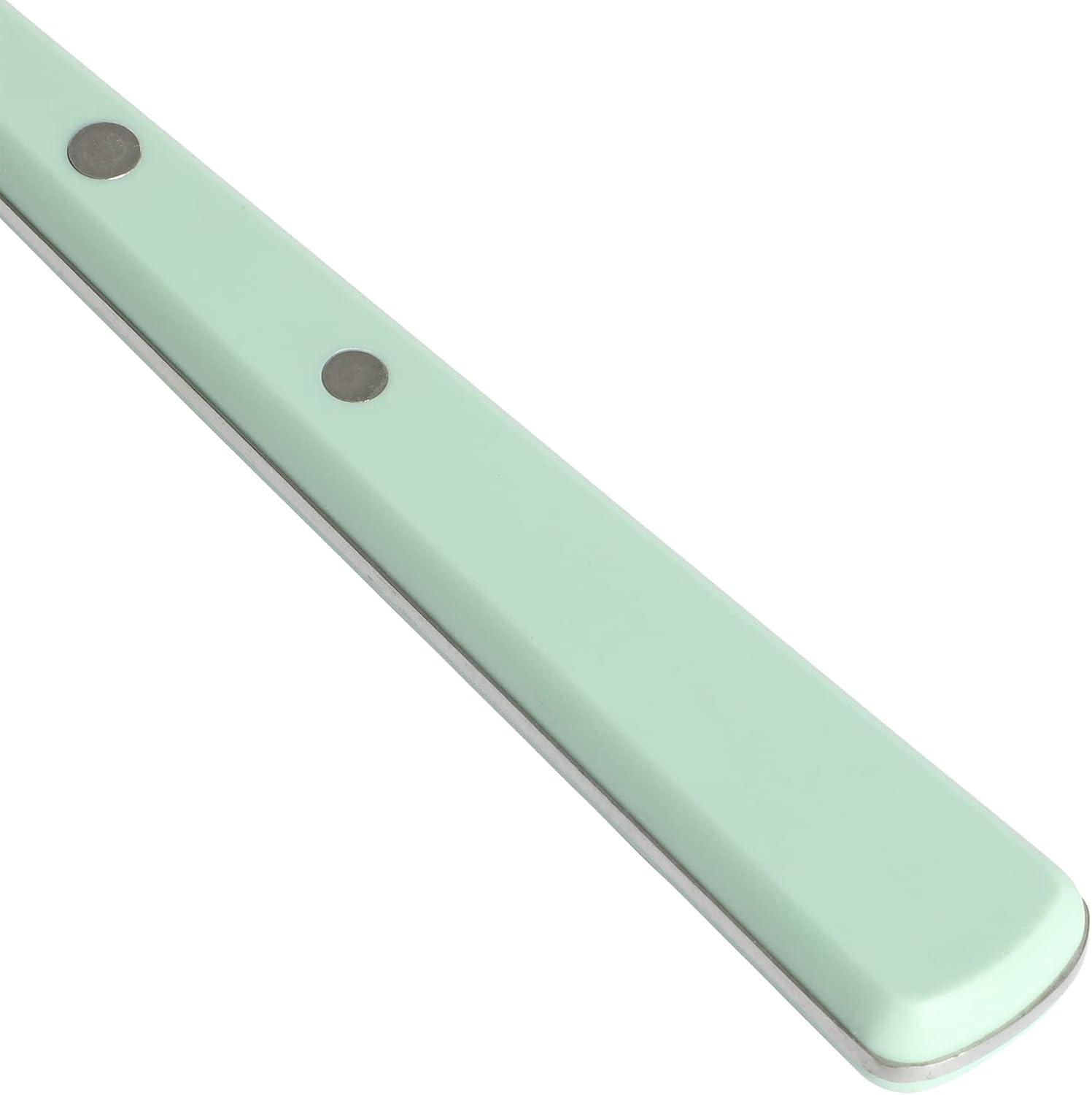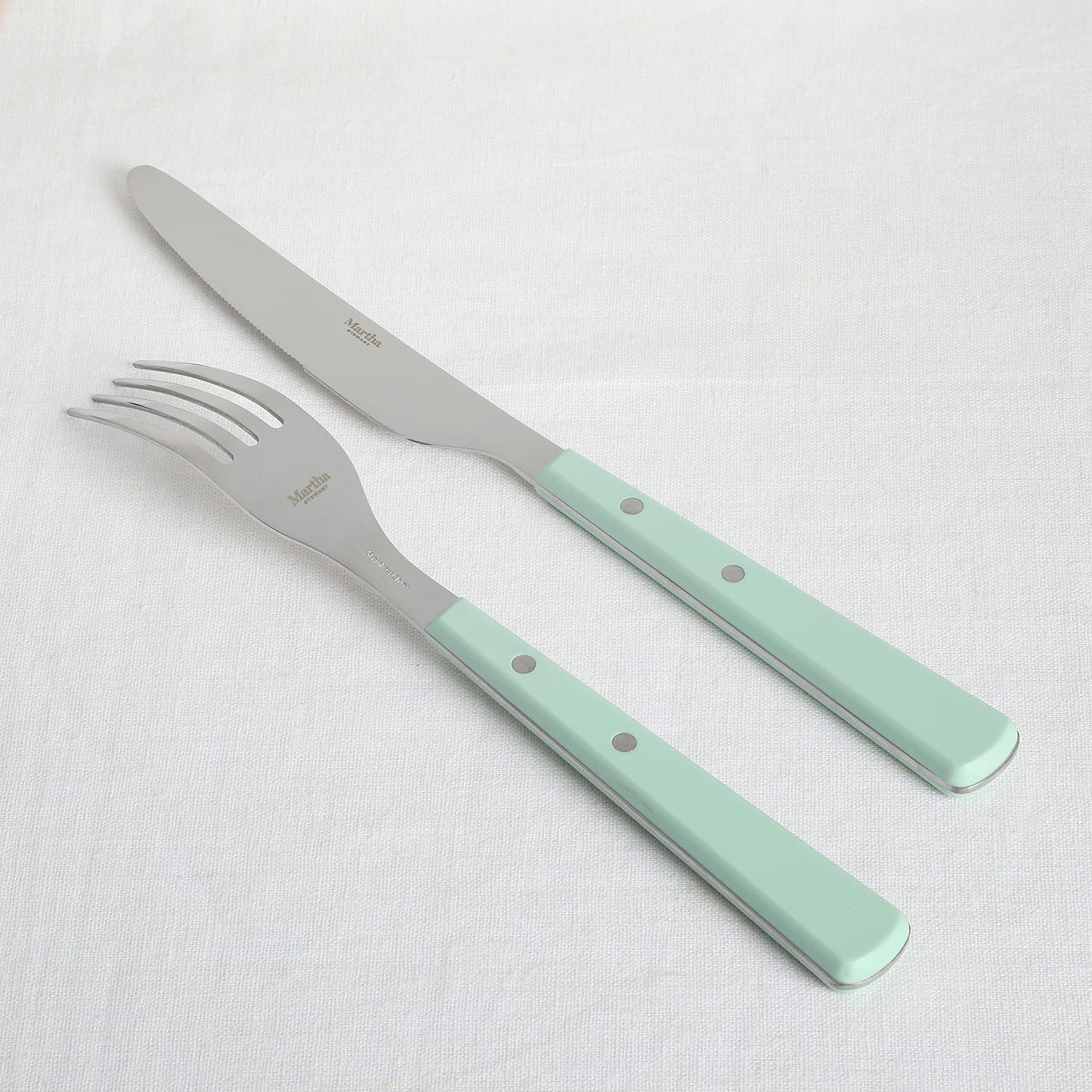 The Martha Stewart Watercliffe 16-piece Stainless Steel Flatware Set in Martha Blue contributes a classic, approachable appeal to any kitchen and dining table. Made from durable stainless steel, the set includes four of each: dinner forks, dinner spoons, dinner knives, and teaspoons. Riveted handles offer a balanced and comfortable grip while enjoying flavorful meals with family and friends. Each flatware features a beautiful, mirror polish for lasting shine and elegance to elevate any dining experience. Dishwasher safe.