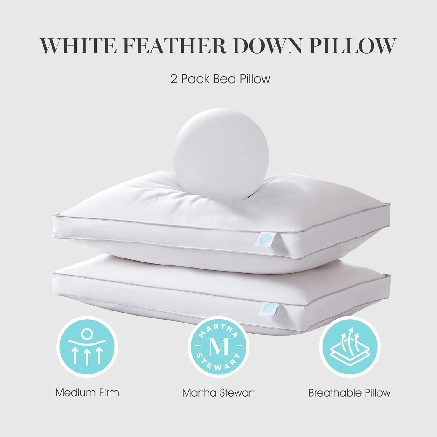 Martha Stewart White Feather Down Pillow Soft-Medium Jumbo Size 2 Pack Bed Pillow for Side Sleeper