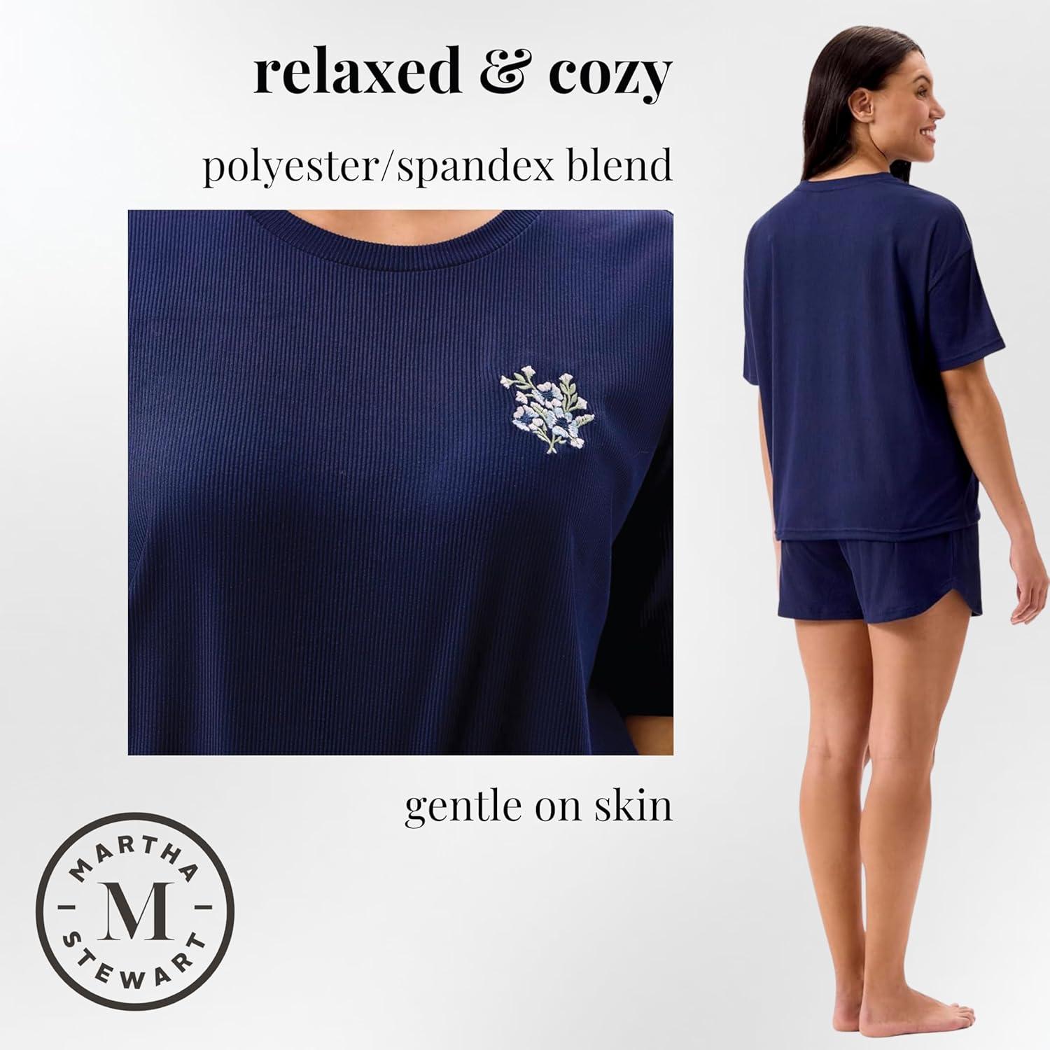 Martha Stewart Women’s Pajama Shorts Set | Soft Ribbed Jersey Sleepwear | 2-Pc Short Sleeve Top and Shorts | Light and Comfy(Medieval Blue)
