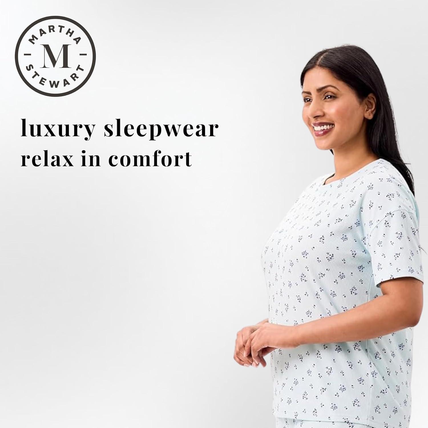 Martha Stewart Women’s Pajama Shorts Set | Soft Ribbed Jersey Sleepwear | 2-Pc Short Sleeve Top and Shorts | Light and Comfy(Quiet Tide)